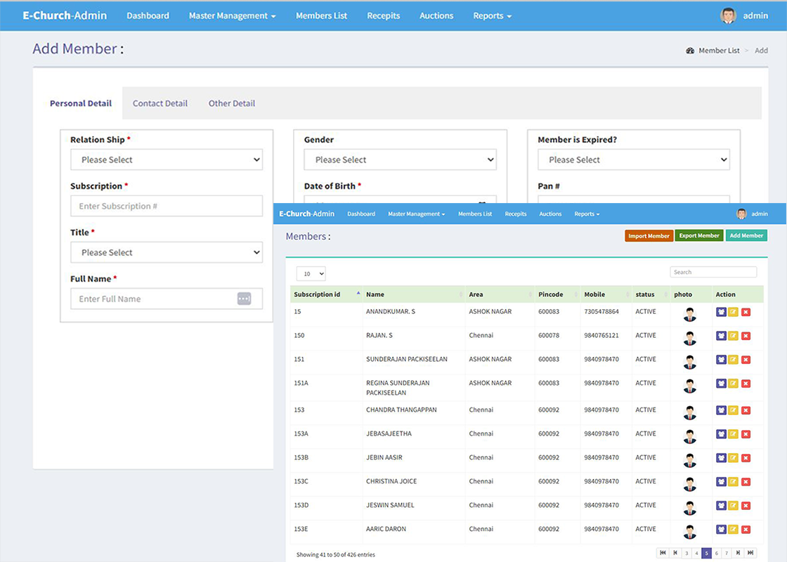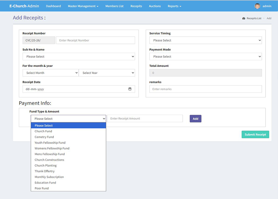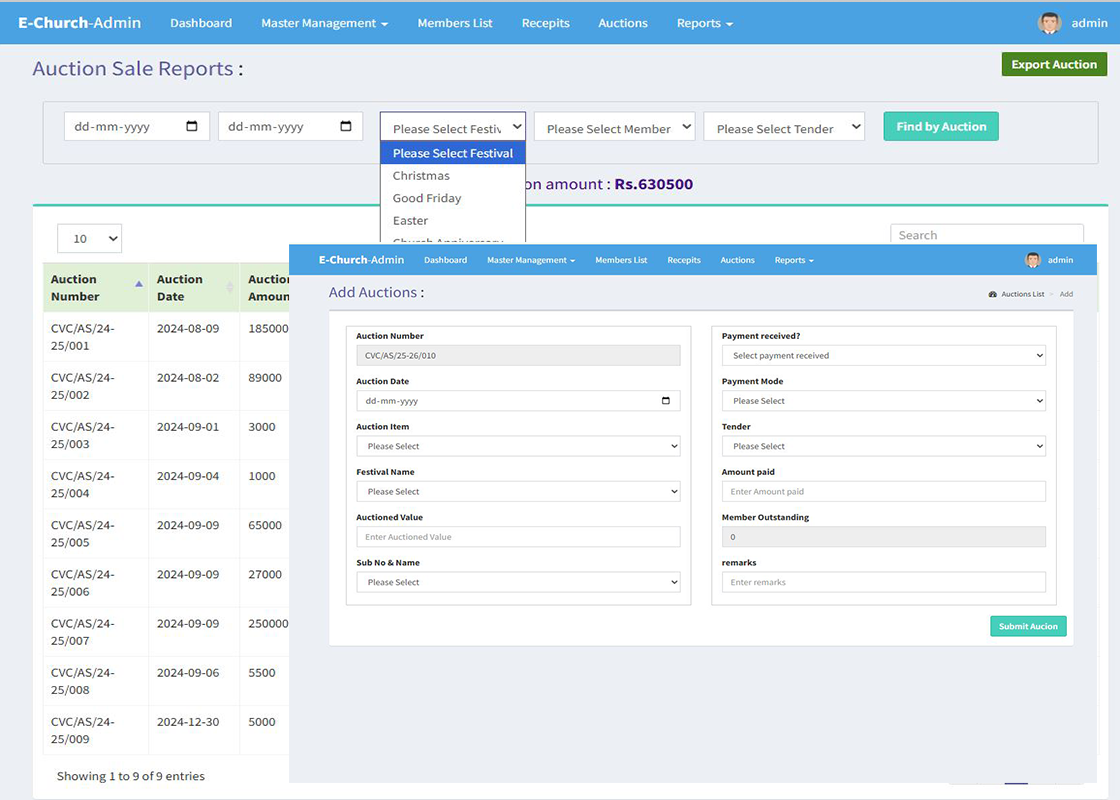 Welcome to eChurch Management a Robust Cloud based web application for maintaining church member subscriptions, store Receipts, Execute Church Auctions, MIS Reports can be integrated with Tally.