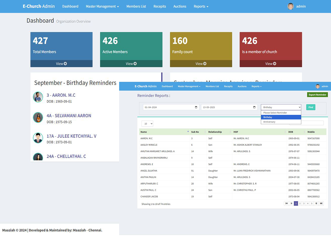 Birthday Remainders: Dashboard will populate for the current month birthday & marriaged dates of all members.