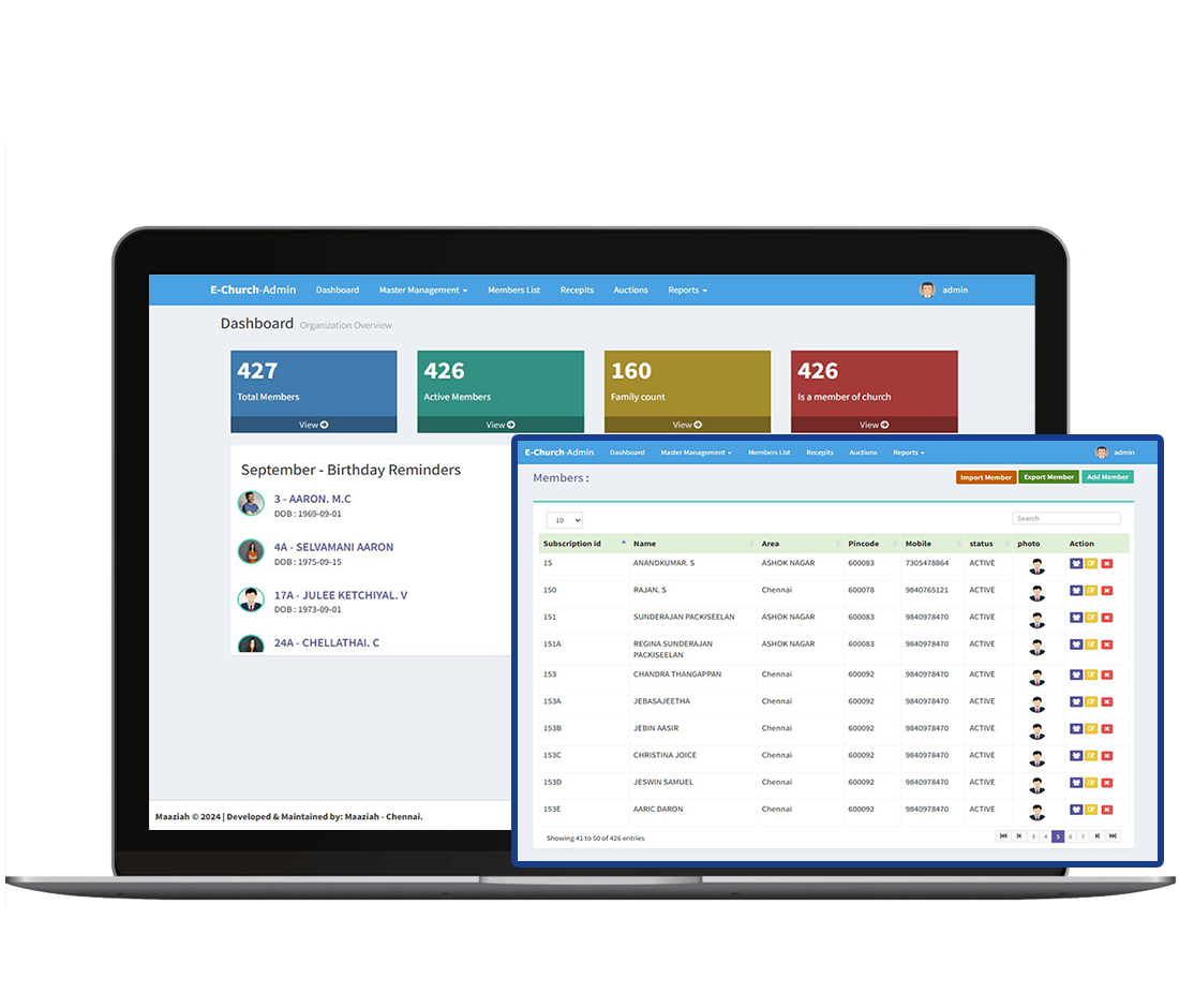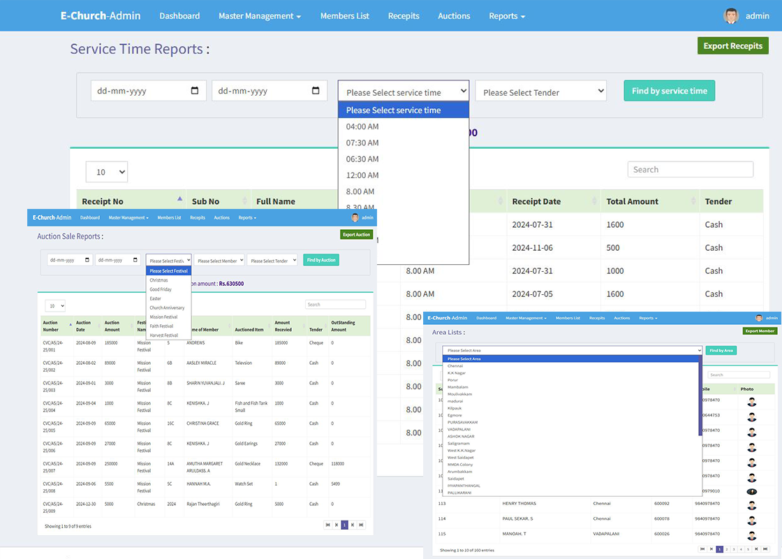 Welcome to eChurch Management a Robust Cloud based web application for maintaining church member subscriptions, store Receipts, Execute Church Auctions, MIS Reports can be integrated with Tally.